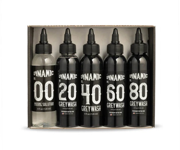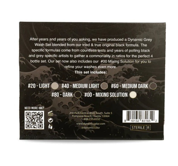 This set of Dynamic greywash tattoo ink was formulated after years of testing and formulating. Each greywash tattoo ink contains the Dynamic #00 mixing solution, which is made with the purest hospital-grade water (filtered, distilled, and UV sterilized). The formula also contains witch hazel for visible smoothness and healing effects on your clients’ skin.